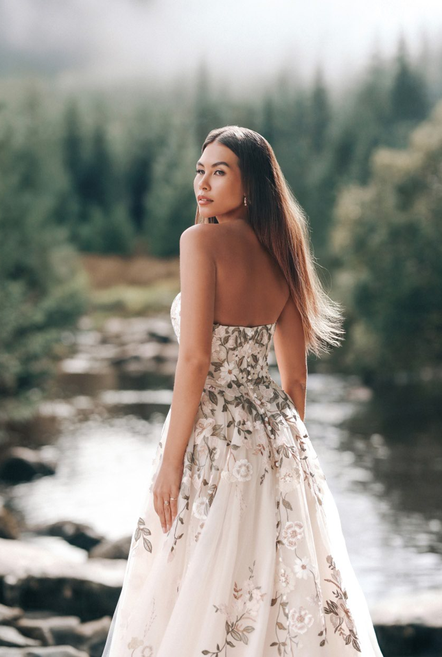 This Pocahontas-inspired bridal gown collection draws from iconic symbols such as the feather and compass. Designed with organic inspiration and effortless elegance, it reflects harmony, strength, and a deep connection to love and nature.